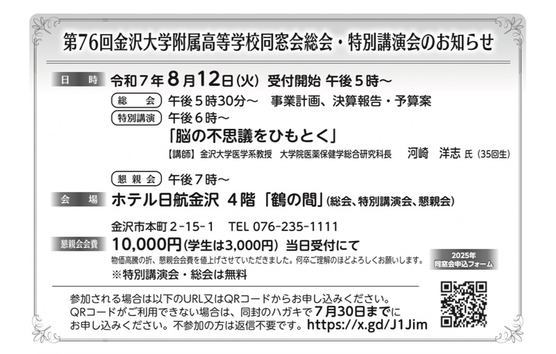 第75回金沢大学附属高等学校同窓会総会・特別講演会のお知らせ